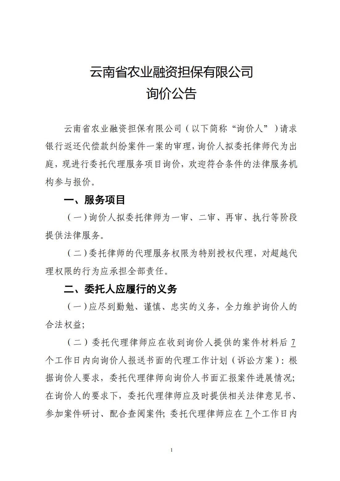 云南省農(nóng)業(yè)融資擔(dān)保有限公司詢價公告