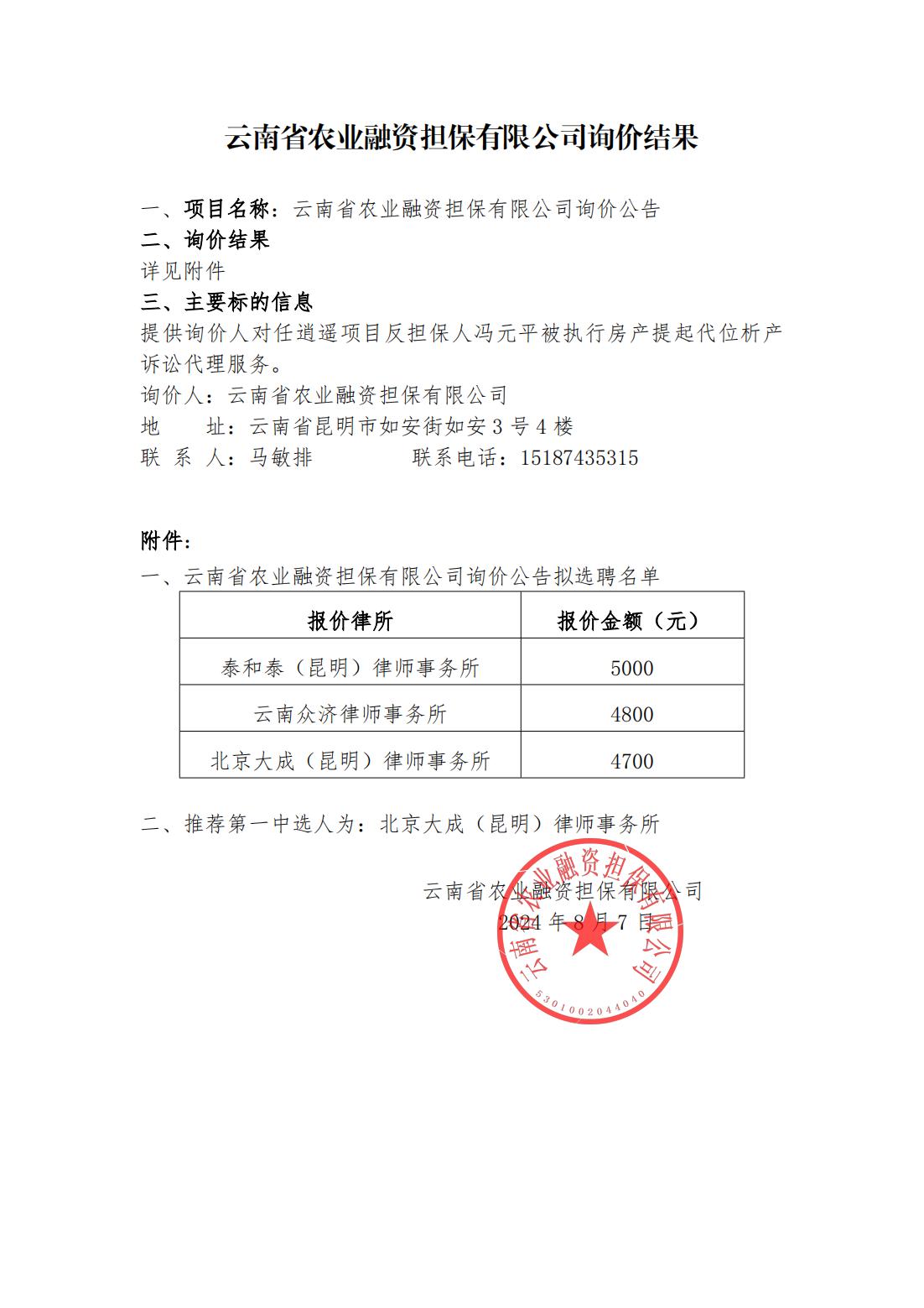 云南省農(nóng)業(yè)融資擔(dān)保有限公司詢價結(jié)果