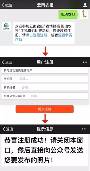 1、活動期間,參賽選手每天通過【云南農(nóng)擔(dān)】微信“影動農(nóng)擔(dān)”平臺投稿。