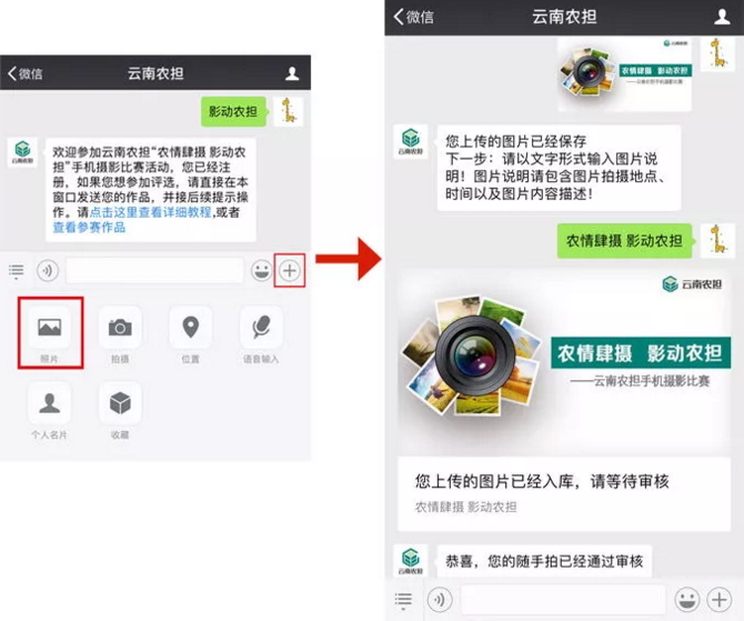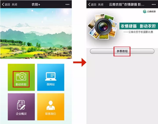 參與方式二:關(guān)注“云南農(nóng)擔(dān)”官方微信號,點擊“農(nóng)擔(dān)+”欄目,選擇“影動農(nóng)擔(dān)”進(jìn)入,查看教程后,完成信息錄入,在對話框內(nèi)發(fā)送1張圖片及一句話描述即可。