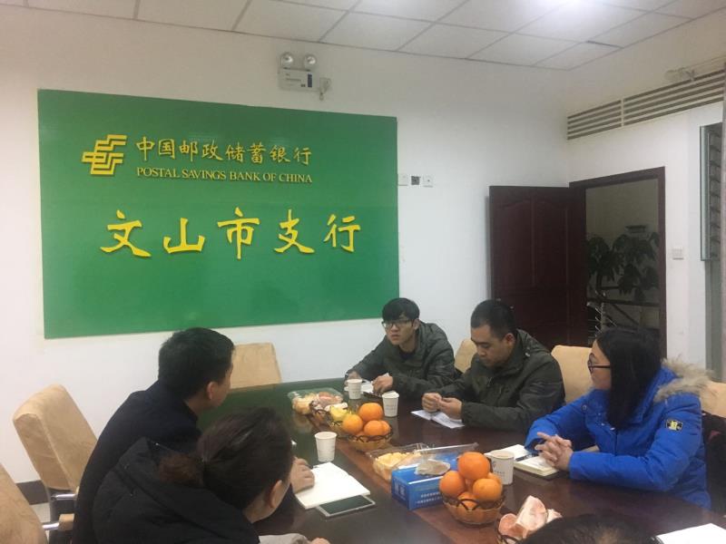 2019年1月8日,文山辦事處全體員工受邀到中國郵政儲蓄銀行文山市支行進行座談,中國郵政儲蓄銀行文山州分行三農金融部總經理、文山市支行行長李洪,文山市支行信貸部主任李順成以及信貸客戶經理參加座談。