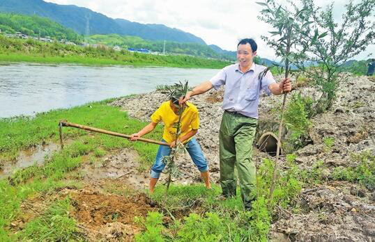 郭彩廷與鎮(zhèn)干部在猴橋鎮(zhèn)古永河邊義務植樹
