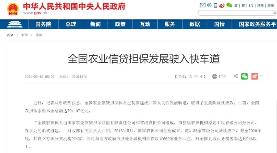 近日,記者從財政部獲悉,全國農(nóng)業(yè)信貸擔保體系已初步建成并步入良性發(fā)展軌道,取得了重要階段性成效。目前,全國農(nóng)擔體系資本金總額達794.07億元。