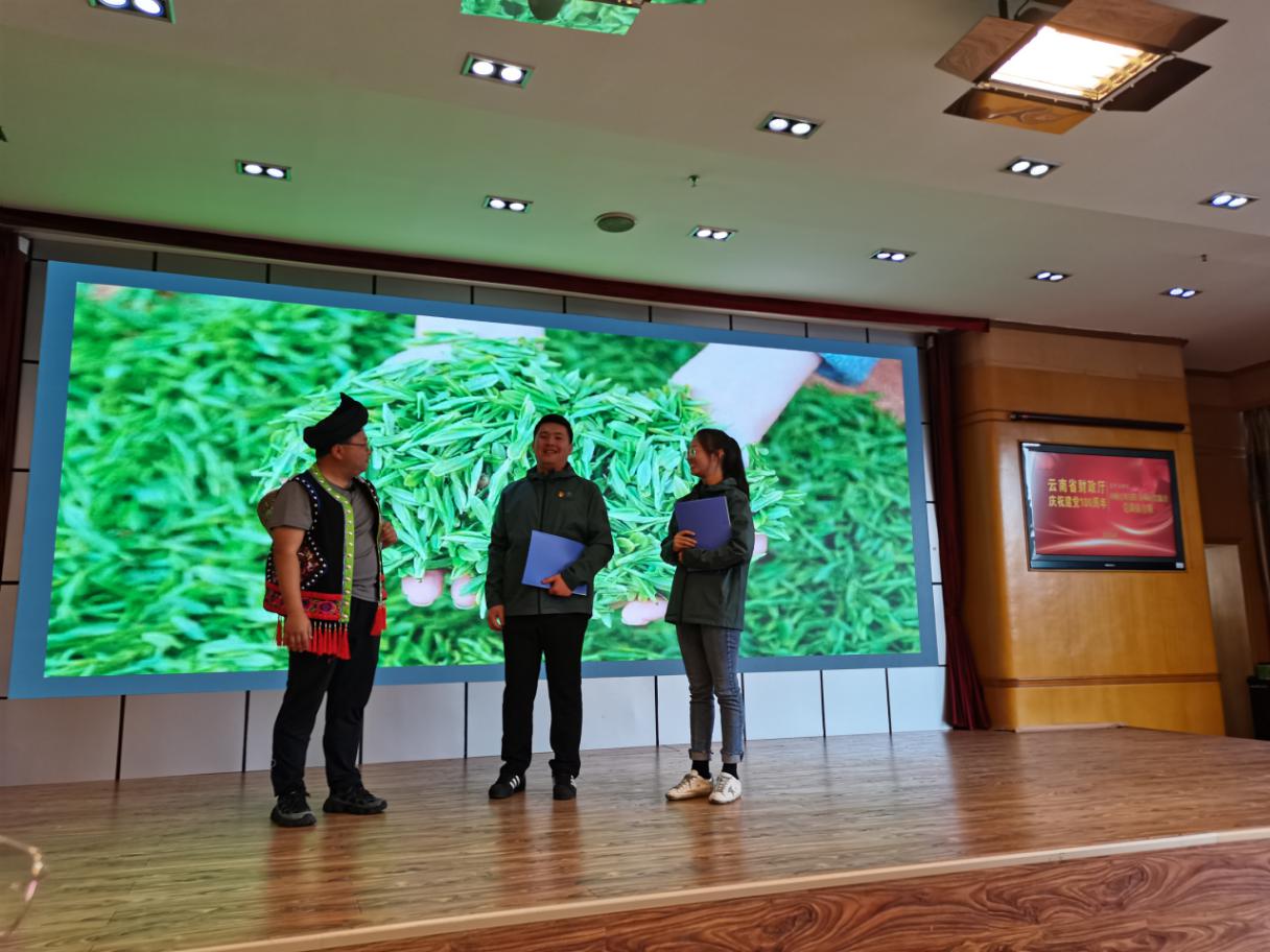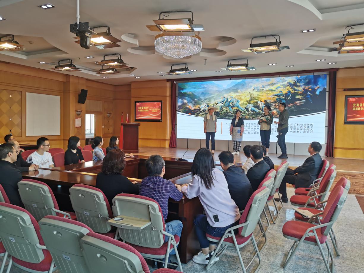首場黨課接力賽共有4個黨支部組隊參加,公司黨總支作為最后一支參賽隊出場。公司黨總支參賽黨課結(jié)合農(nóng)擔(dān)業(yè)務(wù)實際,以“助農(nóng)路上感黨恩”為主題,通過情景劇方式,從業(yè)務(wù)工作場景契入,以時間為軸,由13名黨員職工分別演繹了扎西會議、云南第一個黨支部建立、紅軍過迪慶故事、阿佤人民唱新歌、共克貧困奔小康等5個故事,深情講述了云南黨史上廣為流傳的紅色故事、難忘的光輝時刻,以及黨的好政策。公司黨總支部副書記、董事長杜開波主持了講黨課活動。