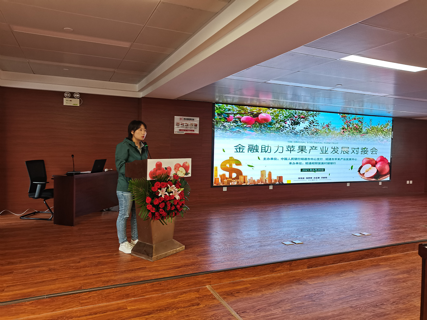 6月29日,昭通辦事處負(fù)責(zé)人劉明晨、項(xiàng)目經(jīng)理馬挺應(yīng)邀參加了由中國人民銀行昭通市中心支行、昭通市蘋果產(chǎn)業(yè)發(fā)展中心主辦,昭通昭陽富滇村鎮(zhèn)銀行承辦的“金融助力蘋果產(chǎn)業(yè)發(fā)展對(duì)接會(huì)”。