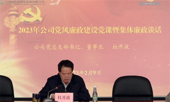 2月9日,云南省農(nóng)業(yè)融資擔(dān)保有限公黨總支部書(shū)記、董事長(zhǎng)杜開(kāi)波在公司年度工作會(huì)議上,為全體職工上了一堂黨風(fēng)廉政建設(shè)專題黨課,并作集體廉政談話。省公司全體職工、州市分支機(jī)構(gòu)負(fù)責(zé)人、主管等現(xiàn)場(chǎng)聽(tīng)課,各州市分支機(jī)構(gòu)全員通過(guò)視頻方式聽(tīng)課。